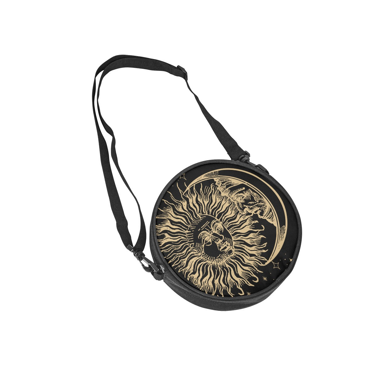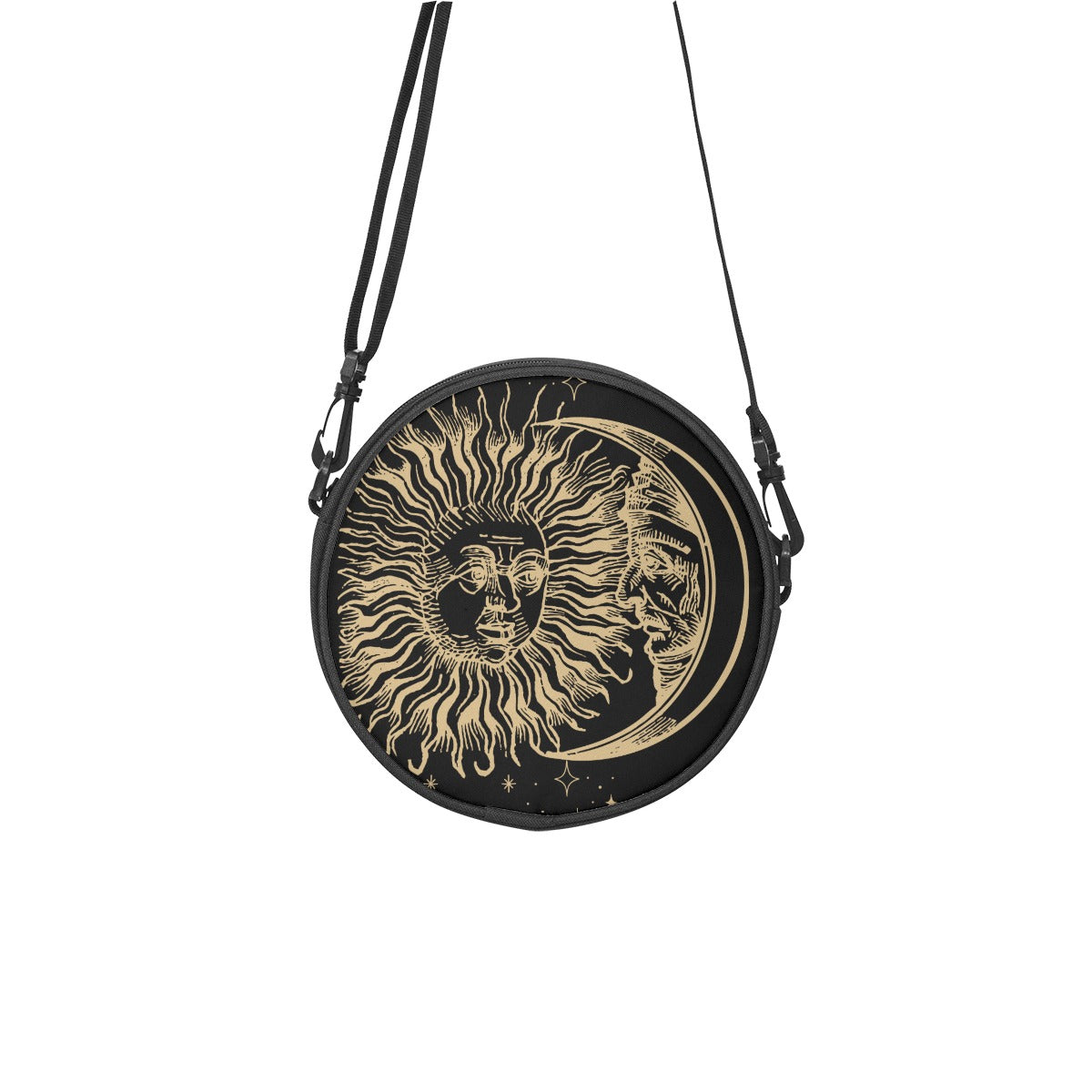 Fekete kerek táska nap és hold motívummal, misztikus dizájn