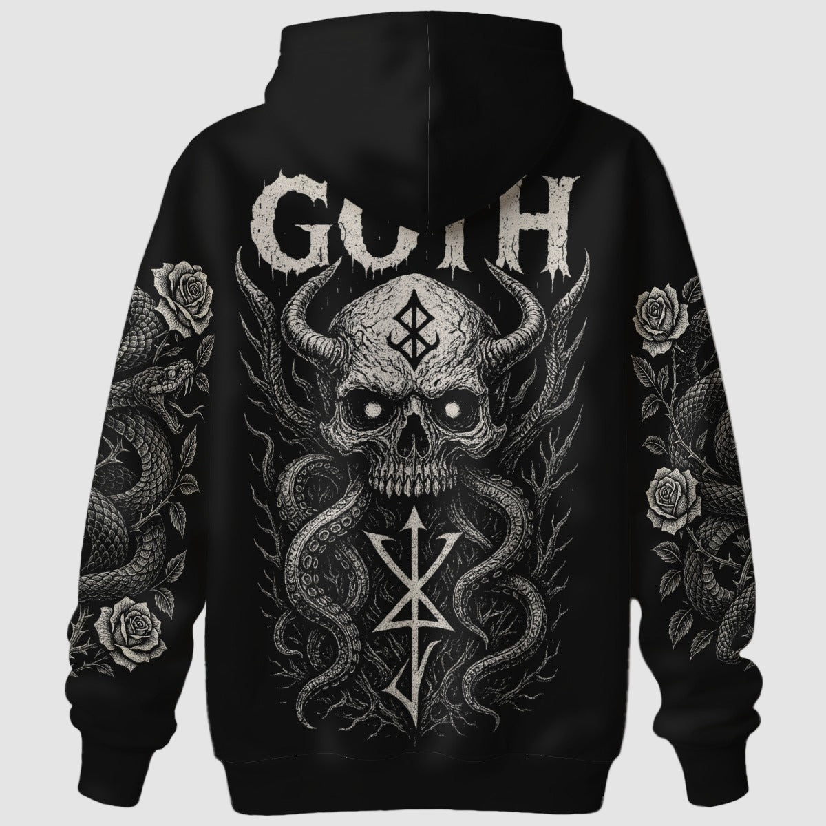 Fejezd ki egyéniséged a „The Serpent’s Oath” egyedi pulóverrel - amelyet a gótikus esztétika és az alternatív divat szerelmeseinek terveztek. A sötét dizájn koponya, kígyók és rózsák motívumával az erőt, a titokzatosságot és a belső békét szimbolizálja. Ez nem csupán ruhadarab – ez egy stílusnyilatkozat.